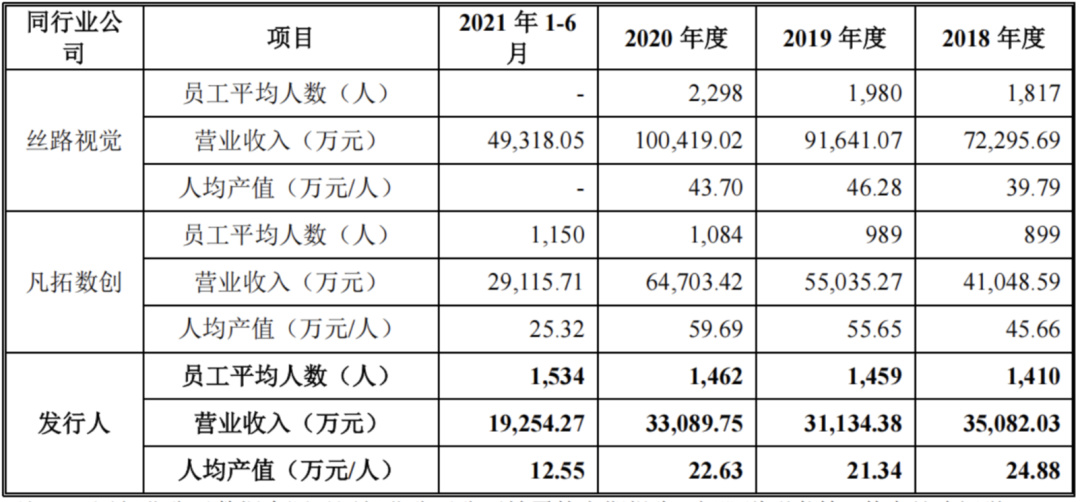 产值方面,原力数字也对比了外包同行丝路视觉、凡拓数创的情况,能发现后两者的人均产值是原力的两倍以上,且正在不断拉大;同时原力的研发费用、研发人员数也跟后两者有数倍差距。