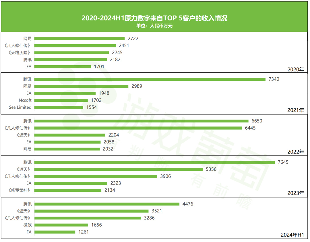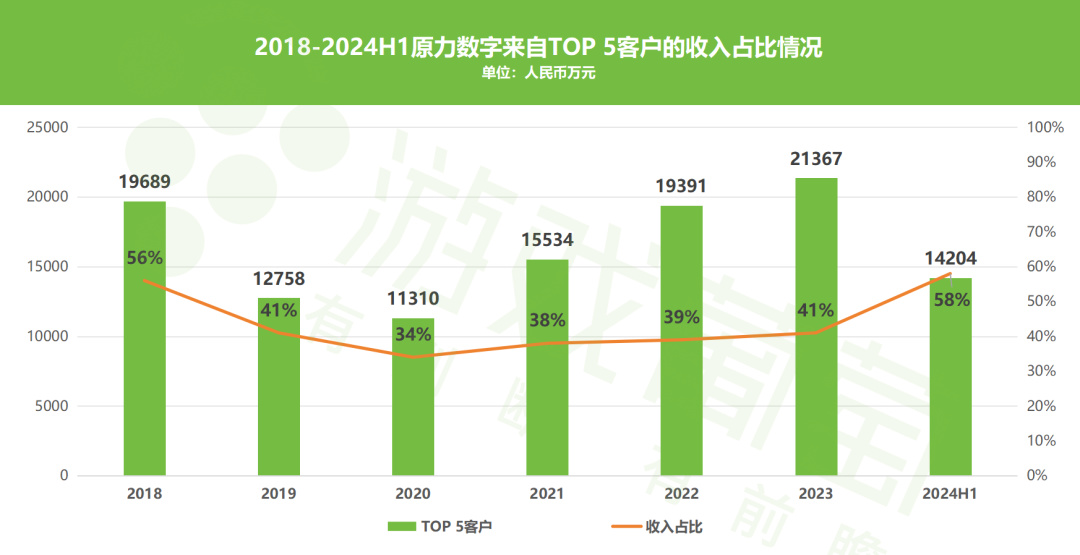 而且原力上市相关报告显示,近几年他们TOP 5的营收占比一直维持在34%以上,其中2018年、2024年上半占比更是超过56%,这意味着原力对于大客户的依赖性较高,进一步影响了公司议价能力,降低了收入稳定性。