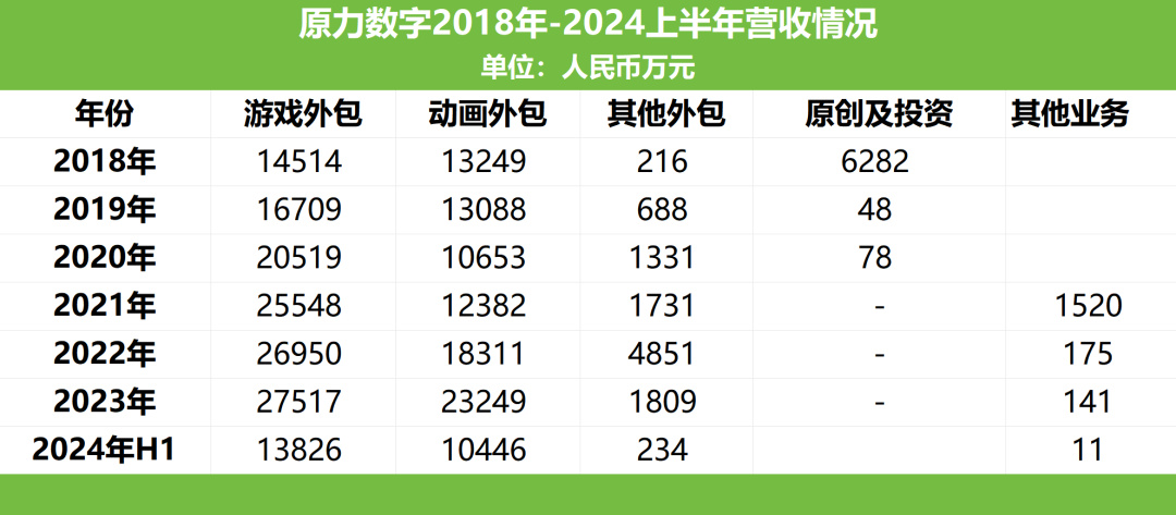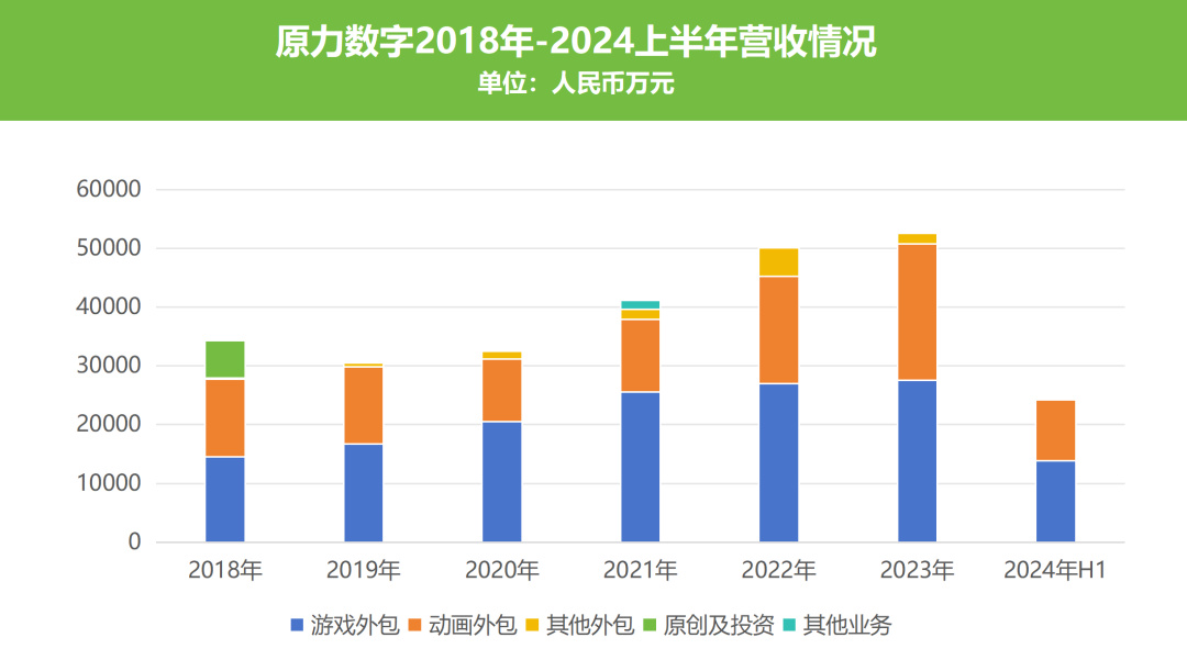 在影视、游戏、动画三大外包及部分原创的支持下,原力公司的年收入逐步增长,2018年至2024年6月,分别达到了3.4亿元、3.1亿元、3.2亿元、4.1亿元、5亿元、5.2亿元和2.5亿元(2024H1)。