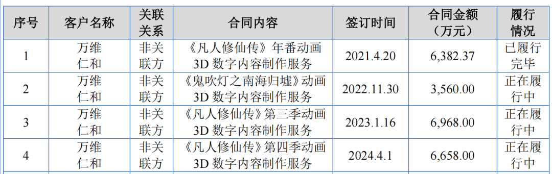 除了影视和游戏外包,原力也吃到了近几年国产3D动画爆发的红利——从原力2024年北交所A股招股书中能看到,最近三年公司新增的TOP 5客户中,有3家的业务来往为国产动画,分别为《凡人修仙传》《遮天》《修罗武神》,这些动画每年的委托金在2000万到6000万左右。