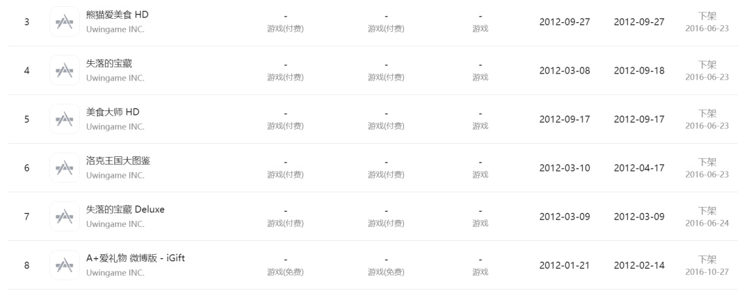 2012年,UWINGAME集中以6元、12元付费的形式上架了一批手游,比如《水果忍者》like的《美食大师》《熊猫爱美食》、三消手游《失落的宝藏》、休闲手游《洛克王国大图鉴》……这些游戏在2016年6月被集中下架。