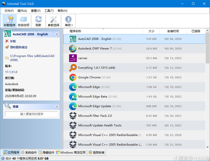 而且還支持安裝追蹤(這個功能很強!)、自啓動項管理、強制刪除痕跡、分類管理、批量卸載等,功能更強更全面。