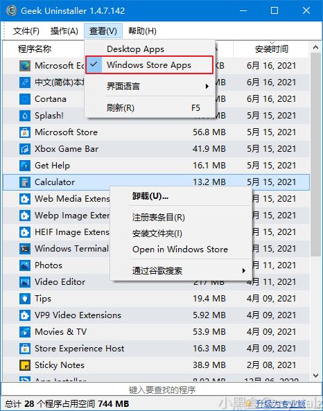 點擊菜單欄中的「查看 - Windows Store Apps」,即可查看安裝的 UWP 應用,同樣通過右鍵菜單進行卸載。
