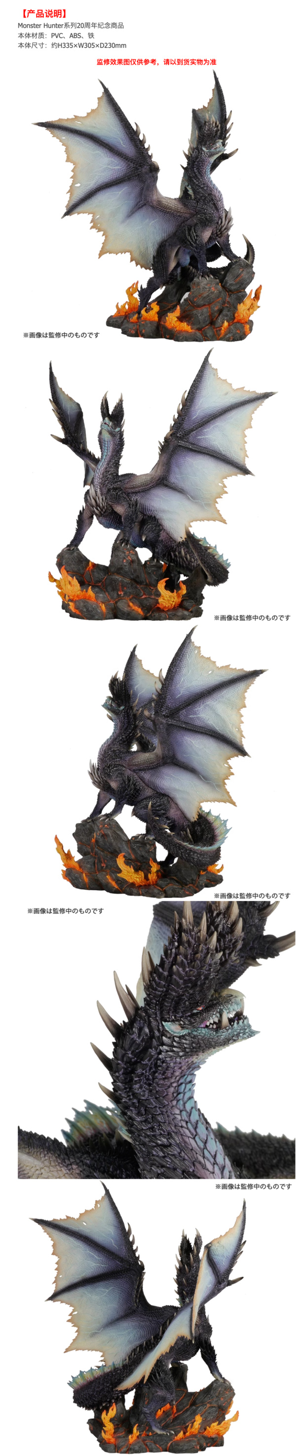 煌黑龙:雕像全高为33.5厘米,宽为30.5厘米,煌黑龙身体生长着锐利的刃"逆鳞",并且被逆鳞重叠形成的“逆壳”所覆盖,头部无数个角重叠形成一对贯通天一般弯曲、形状巨大的角。雕像有力地张开翅膀,仰天长啸的姿态营造出一股压倒性的力量感。整体涂装采用了紫黑色还原煌黑龙的鳞片颜色,锐利的鳞片在龙身进行了详细的刻画,锐利爪子之下底座采用了“幽境之谷”造型塑造。整体充斥着一股不祥之感,既像一片深邃的黑暗,又像一束妖异的光芒,神性十足,令人着迷。