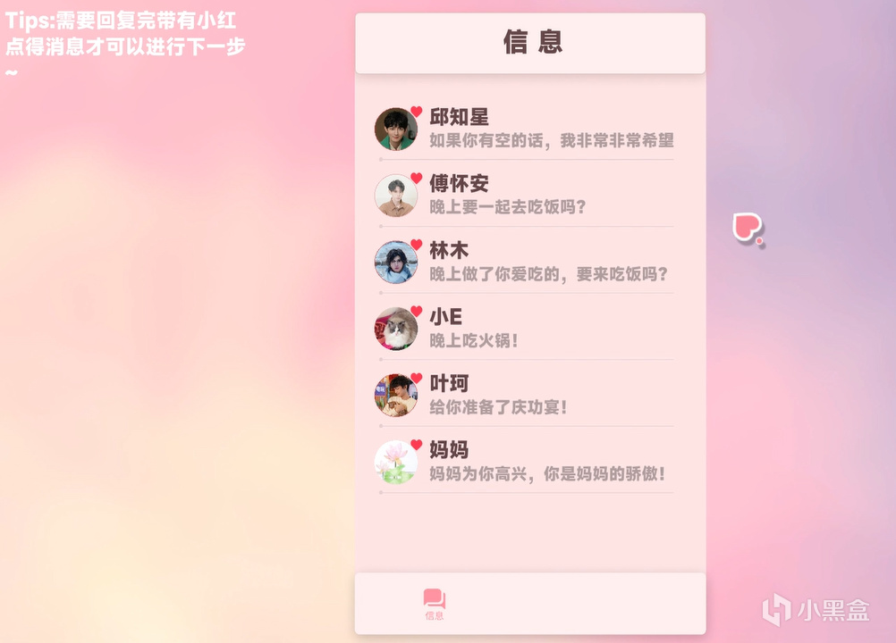 遊戲中需要點擊處理聊天信息,觸發下一段劇情內容。左上角生硬的tips,在引導上也沒有多下功夫。