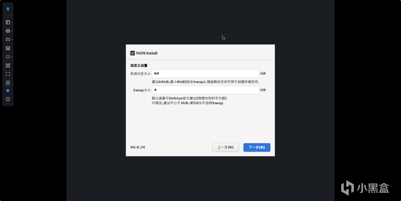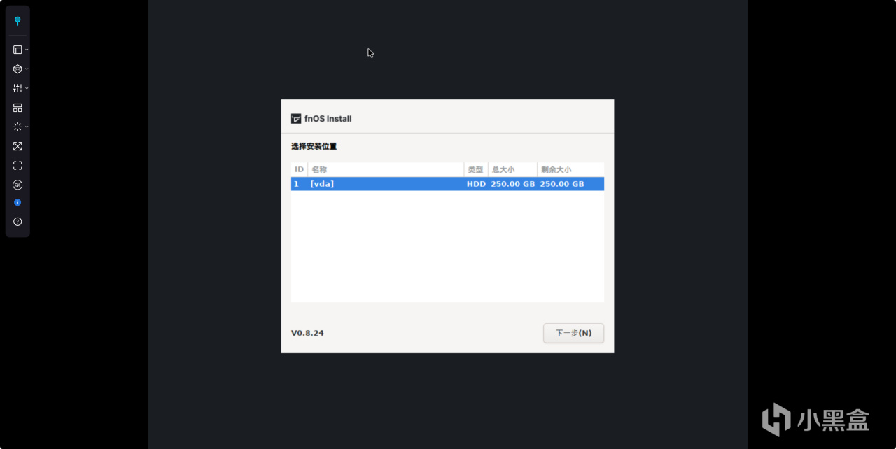 打開虛擬機裏的那個web啓動界面,咱們就可以開始設置fnOS啦,點擊“下一步”按鈕。