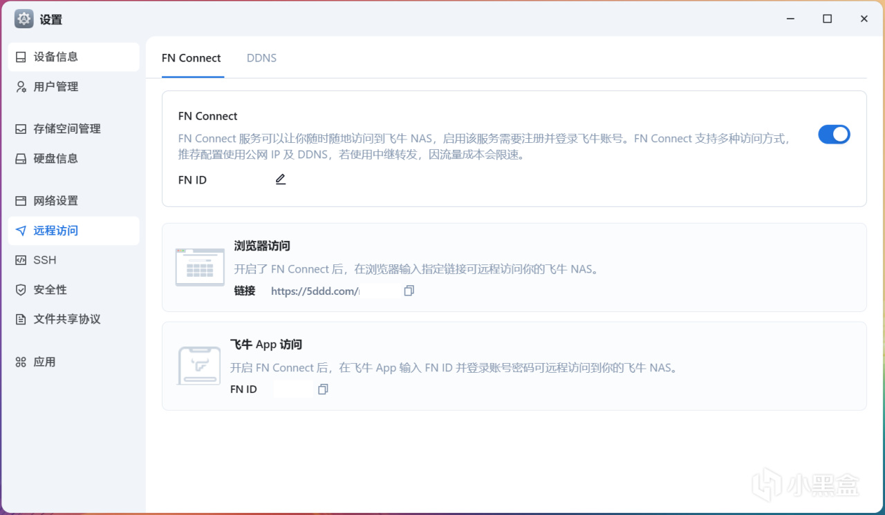 遠程訪問可以設置使用飛牛FN Connect服務,通過手機APP或電腦客戶端輕鬆連接到遠程設備,支持多種操作系統和設備類型,或是使用DDNS動態域名解析服務,通過將設備的公網IP地址與一個自定義的域名進行綁定,通過域名在互聯網上訪問到遠程設備。
