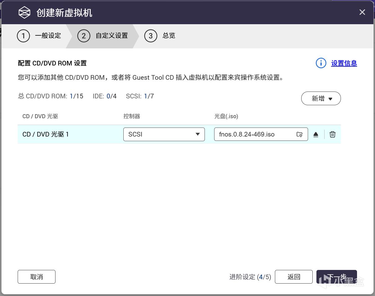 光驅設置,控制器建議選擇“SCSI”,光盤(.iso)找到已上傳至NAS的fnOS鏡像文件,然後點擊“下一步”按鈕。