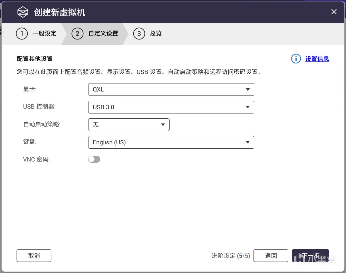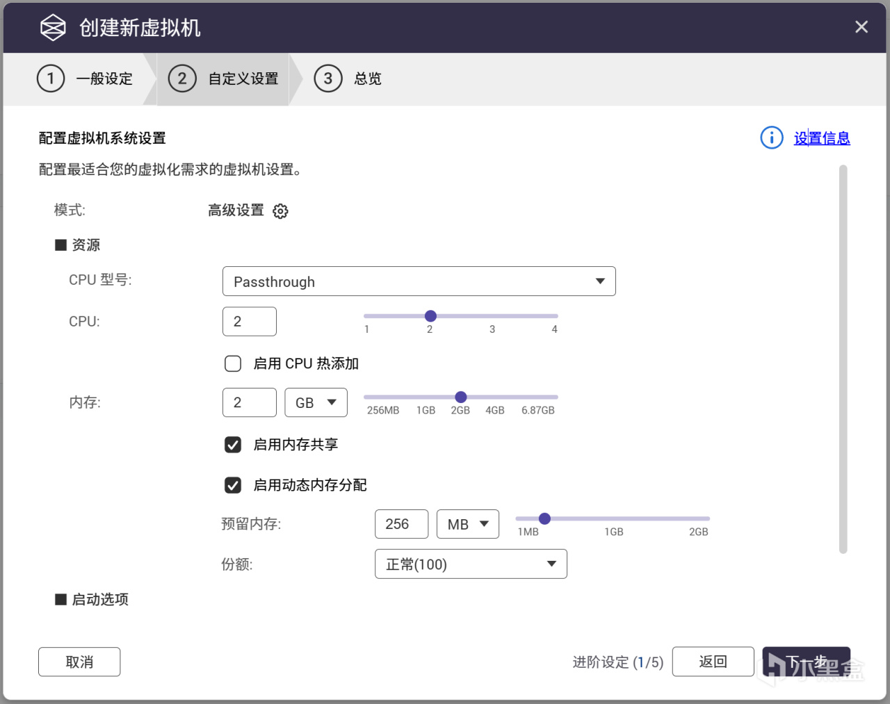 根據飛牛OS官方的虛擬機安裝教程,推薦選擇Passthrough的CPU類型,這樣可以充分利用NAS主機的CPU性能。CPU方面,建議至少2核;內存方面,建議至少2G。其他設置可以保持默認,設置完成點擊“下一步”按鈕。