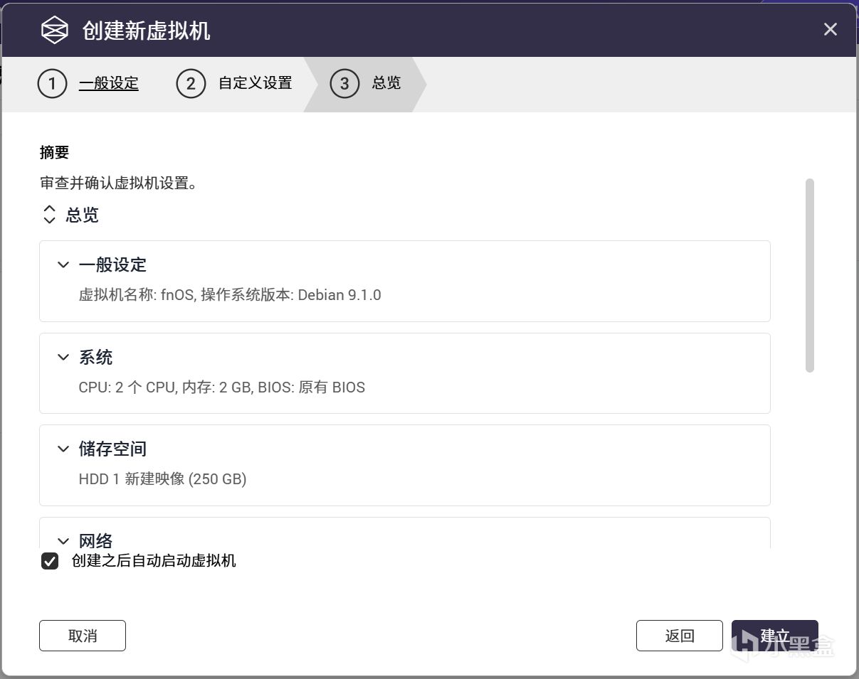 看看總覽,如果沒有問題,勾選上“創建後自動啓動虛擬機”,然後點擊“建立”按鈕就行了,耐心等待虛擬機創建完成。