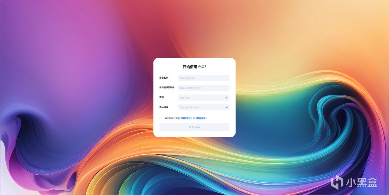 開始設置飛牛OS吧,先給設備起個名字,再設置賬號和密碼,設置完成後勾選“我已閱讀並同意《隱私協議》和《服務條款》”就可以進入fnOS啦。
