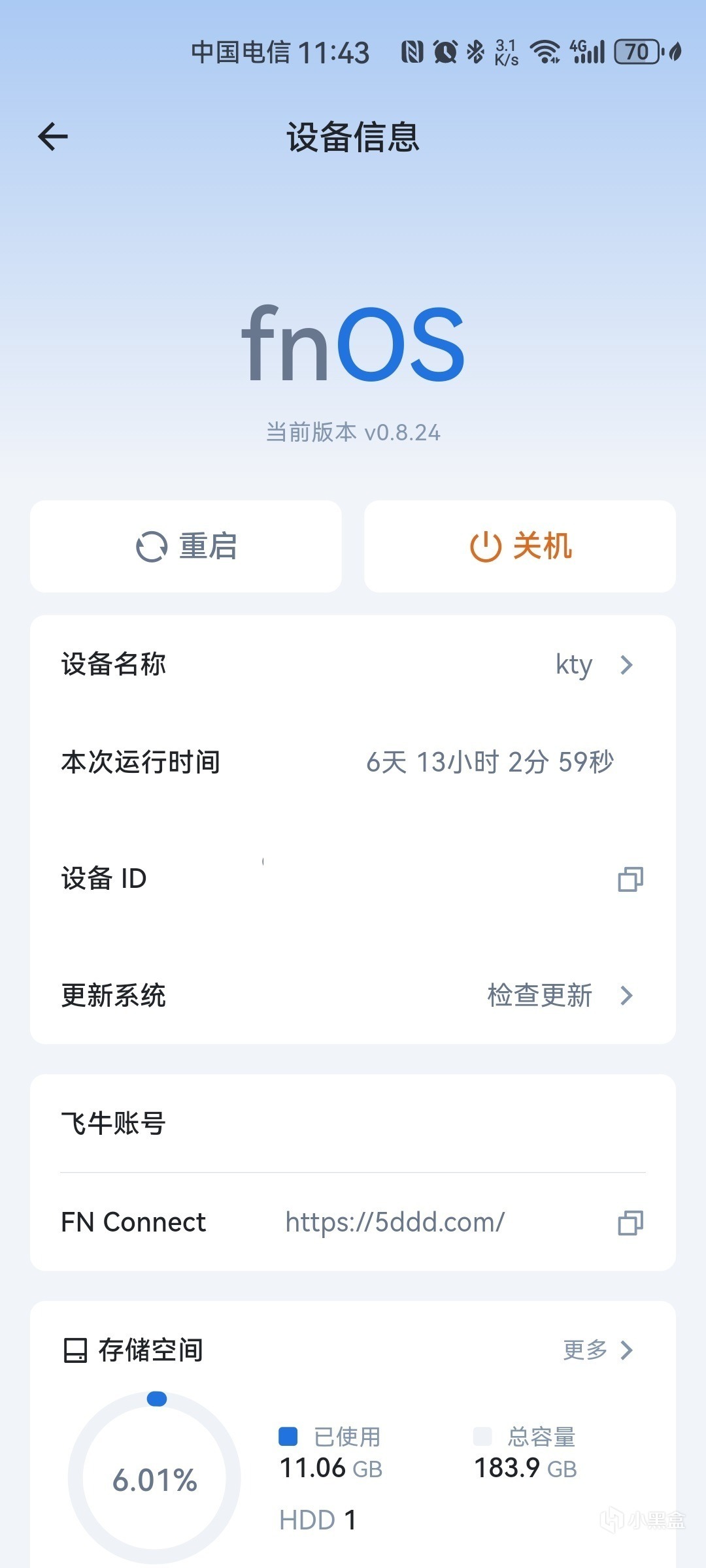 設備信息展示得非常詳細,包括設備名、ID、系統版本、運行時間,還有賬戶狀態、存儲空間使用情況、網絡連接狀態等,一眼就能看懂。