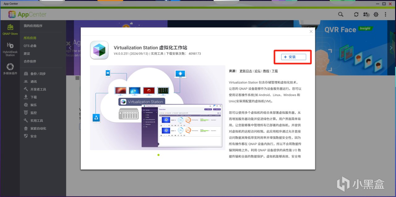 在應用程序中心中,瀏覽並找到“Virtualization Station 虛擬化工作站”,然後點擊“安裝”按鈕,耐心等待安裝程序完成。