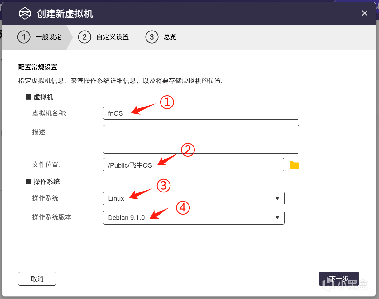 ③飛牛OS是基於Linux內核(Debian發行版)的,所以操作系統就選“Linux”