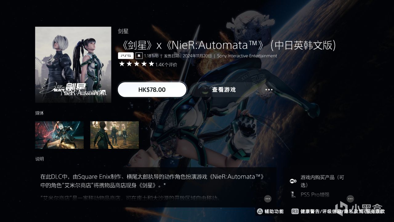 再说一下世界观,你可以当尼尔的同人作品的世界观。世界观几乎是一样,都是末日后居住在外太空的人类为了夺回地球而派出主角团队去讨伐霸占地球的物种,进而探讨机械怪物与人类该如何生存的主题。打的敌人除了畸形种就是机器人这点是我不喜欢的,不管是尼尔还是剑星世界观的背景和敌人的物种都不是我喜欢的类型,但不妨碍大家喜欢。有喜欢尼尔世界观的玩家也可以大胆尝试这部作品,尼尔粉可以把它当作一款强化战斗弱化剧情和意境的尼尔精神续作。而且剑星的制作人本身好像也是尼尔的粉丝,在制作剑星的过程中也和横尾太郎有很多交流。这里插一下伊芙可以购买尼尔联名DLC秒变2B小姐姐,而且连爆衣都很还原哦。就是DLC有点贵不过上了PC穿不穿都不知道,DLC更是形同虚设。