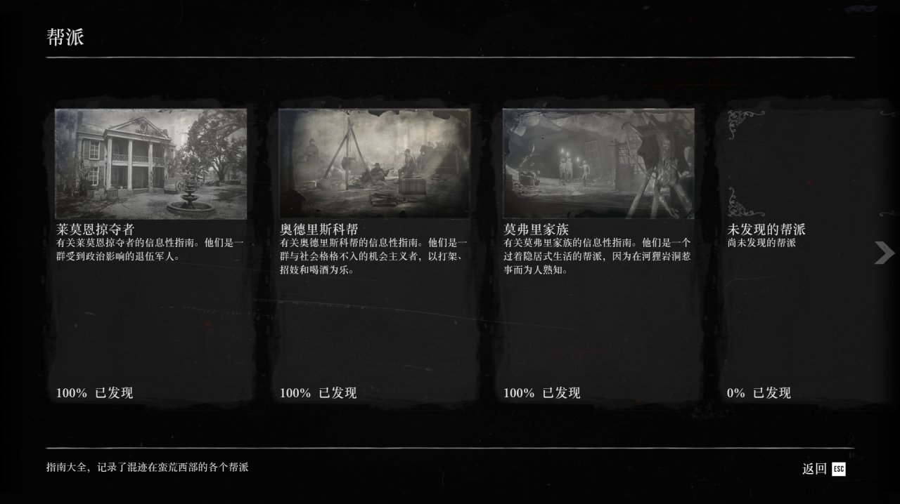 d.帮派,拉雷米帮和剥皮兄弟帮不解锁,奥帮,莱莫恩,莫弗里都已百分百,啸狼帮能做的进度都做。