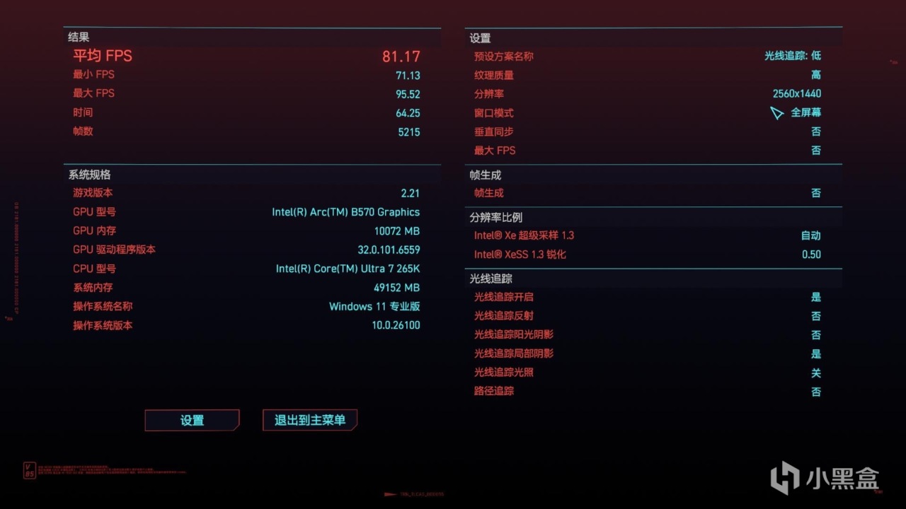 遊戲中2K分辨率+低級光追+XeSS+高畫質,遊戲幀率66FPS左右,關閉光追遊戲幀率能達到77-80FPS。