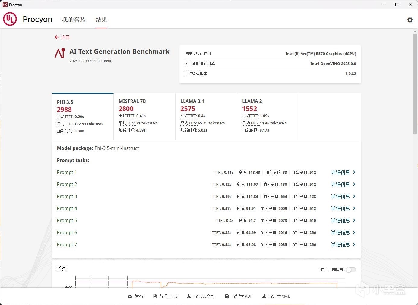 AI Text Generation Benchmark可以反覆且一致地測試多個LLM AI模型,測試的模型包括PHI 3.5 mini、MISTRAL 7B、LLAMA3.1 8B 和 LLAMA2 13B,使用OpenVINO運行測試,測試結果如下: