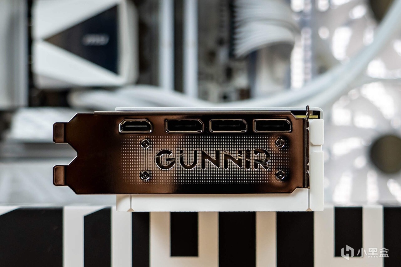 值得一提的是,藍戟B570 Photon的顯卡擋板做的非常精緻,鏤空的“GUNNIR”字樣以及漸變設計的網格紋理讓我不禁眼前一亮。