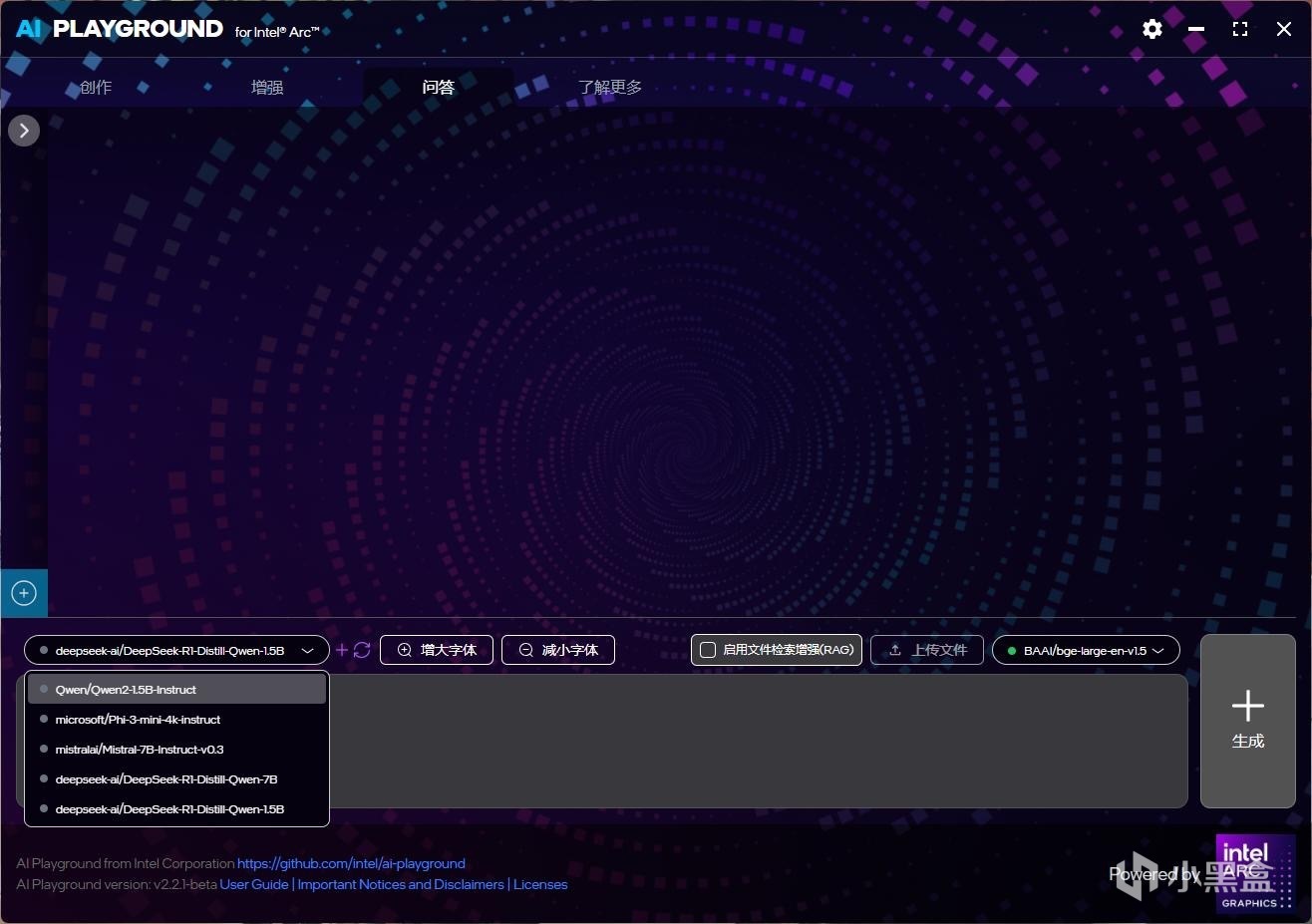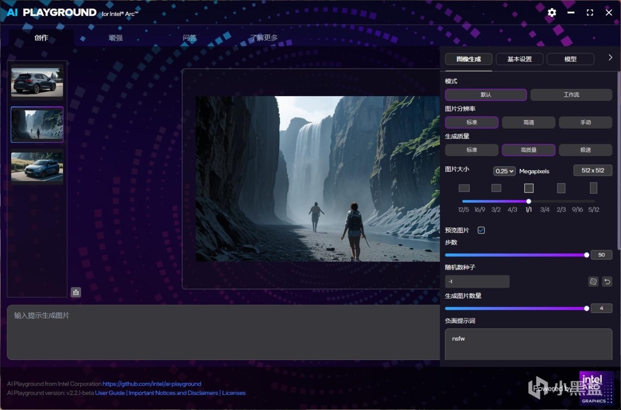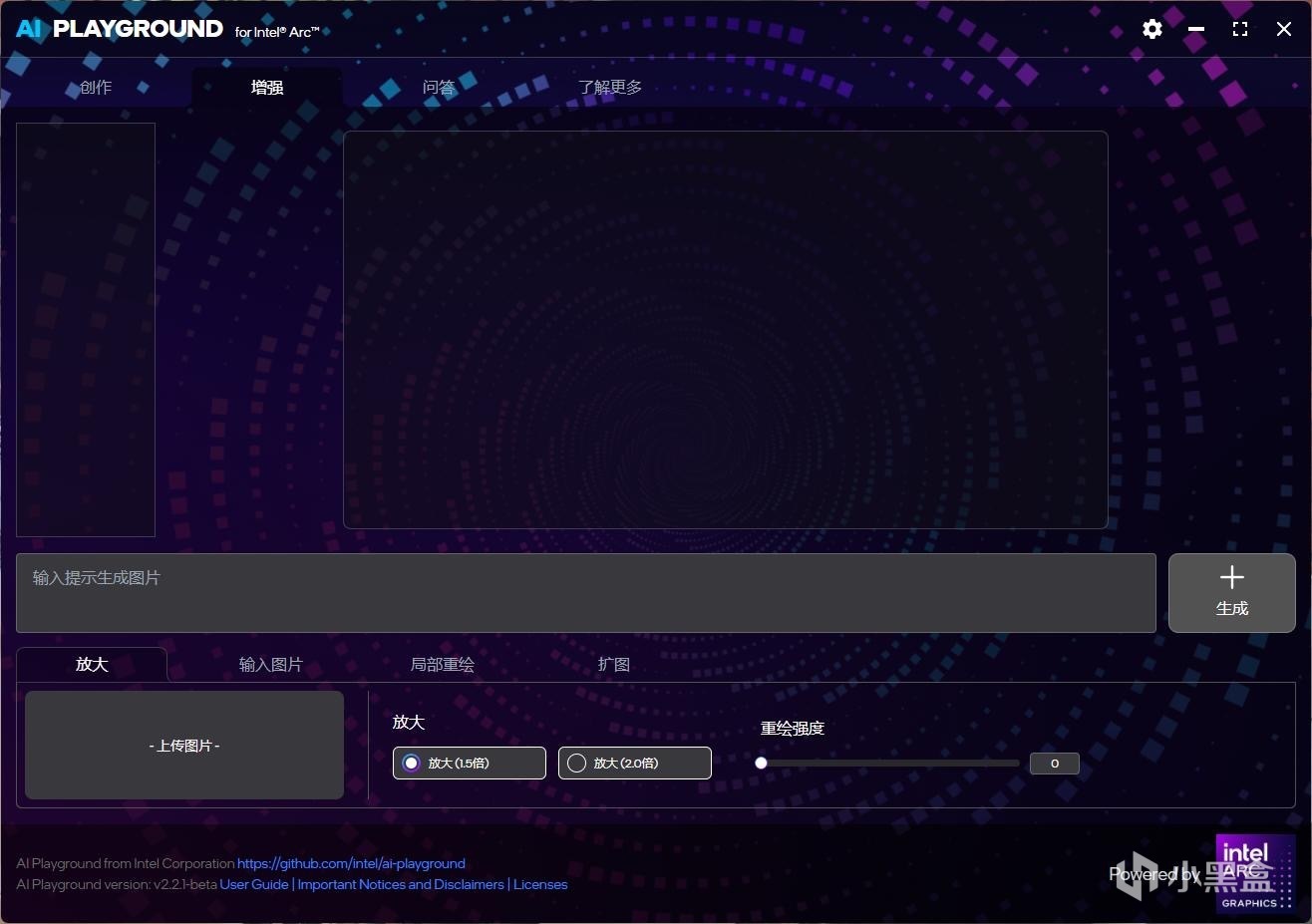 值得一提的是,Intel爲用戶提供了自研AI軟件AI PLAYGROUND,集成了AI創作、創作增強、大語言模型等AI創作功能,集成了主流AI模型並對設置過程簡化、優化,方便新手使用。
