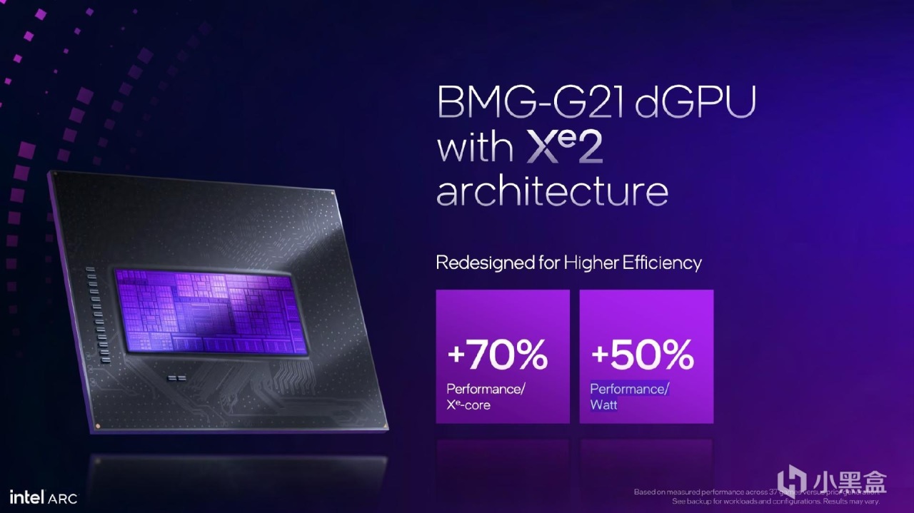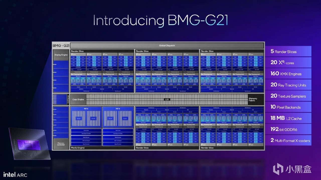 BMG-G21這枚GPU芯片擁有5 個渲染切片,每個渲染切片包含4個Xe核心,共20個Xe核心;每個Xe核心都有8 個512位矢量引擎、8個2048 位XMX引擎、1個專用光線追蹤單元。據英特爾稱,與上代相比,BMG-G21的每個Xe內核性能提高了 70%,每瓦性能提高了50%。