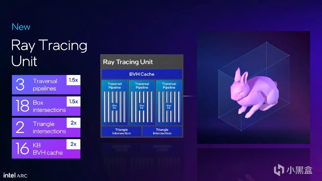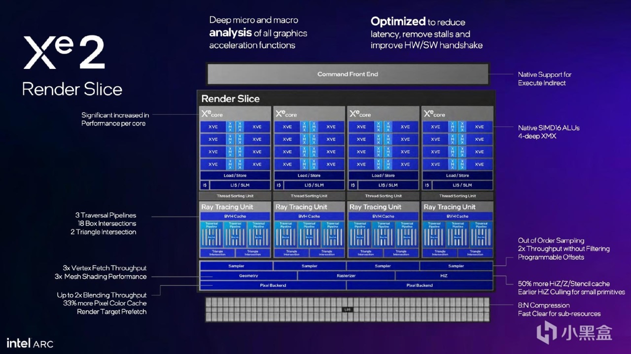 Xe2核心的另一個重要部分是光線追蹤單元,它有3個遍歷管線,18個盒形交叉點和2個三角形交叉點,BVH緩存增大到16KB,是上代的2倍。儘管光追單元與Xe2核心解耦,但仍保持1:1配置,確保每個核心的光追資源獨立分配,避免共享資源導致的爭用問題。這種設計在保持靈活性的同時,兼顧了光追與通用計算的平衡。