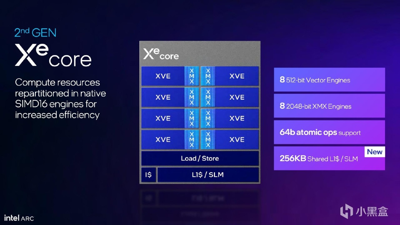 Xe2核心在計算單元設計上進行了顯著升級,每個Xe2核心配備8個512bit XVE矢量引擎(傳統圖形計算)和8個2048bit XMX矩陣引擎(AI加速),支持SIMD16和SIMD32指令,並新增對TF32數據格式的優化,提升了計算資源分配的靈活性。此外,新增的 256KB共享L1緩存/SLM緩存減少了數據訪問延遲,提升了計算效率。
