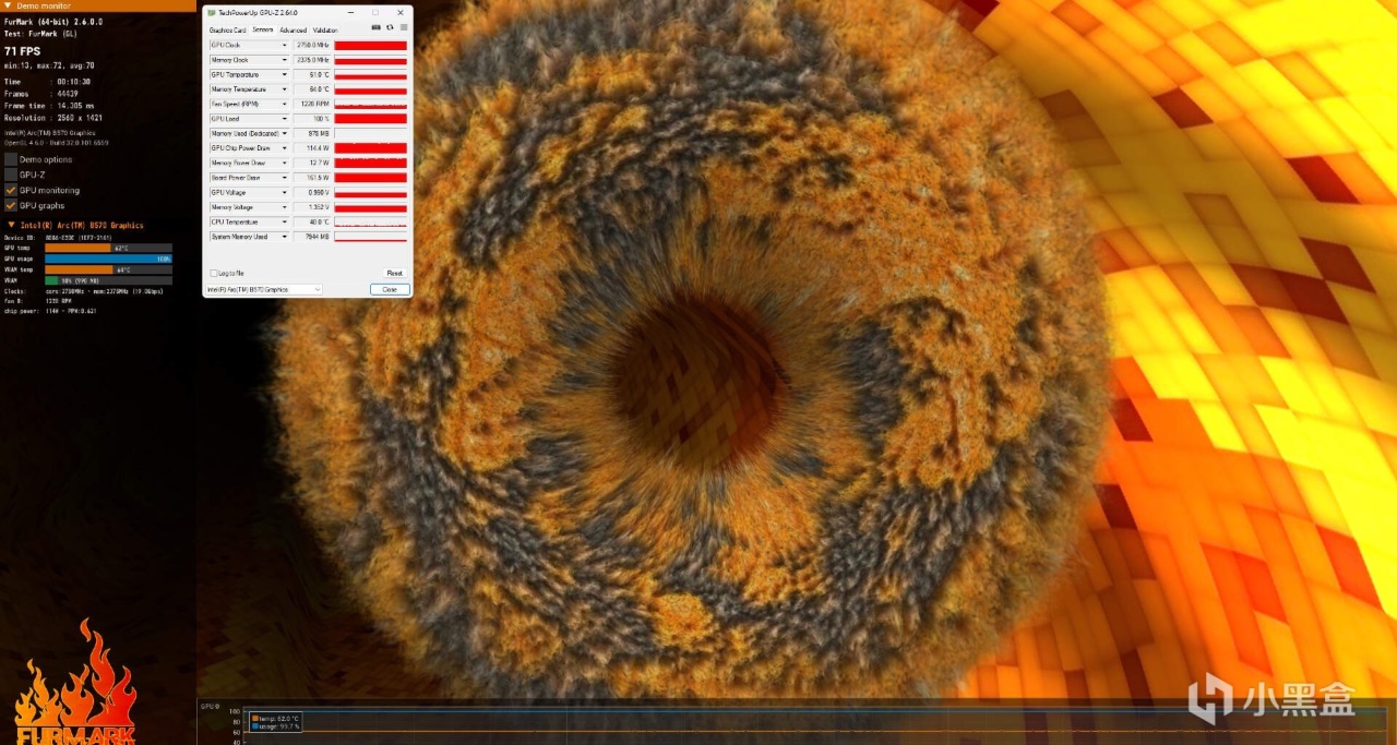 在FurMark顯卡壓力測試中,2K分辨率滿載10分鐘測試,藍戟B570 Photon的溫度只有61°C,核心功耗114W,整卡功耗160W左右。而我之前測試過的上一代藍戟A750 Photon滿載時的核心功耗超過170W,整卡功耗超過220W。