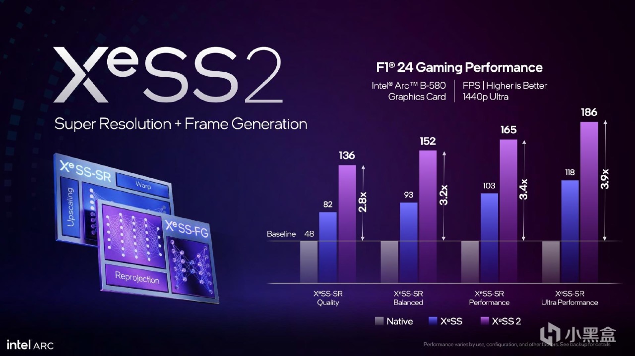 在2K最高畫質下原生畫面平均幀率48fps,開啓XeSS後幀率可提升至82fps,開啓XeSS2後(同時開啓XeSS-SR和XeSS-FG)幀率可提升至136fps,是原生畫質的2.8倍,是第一代XeSS的1.6倍。