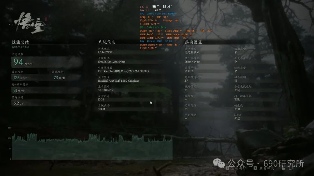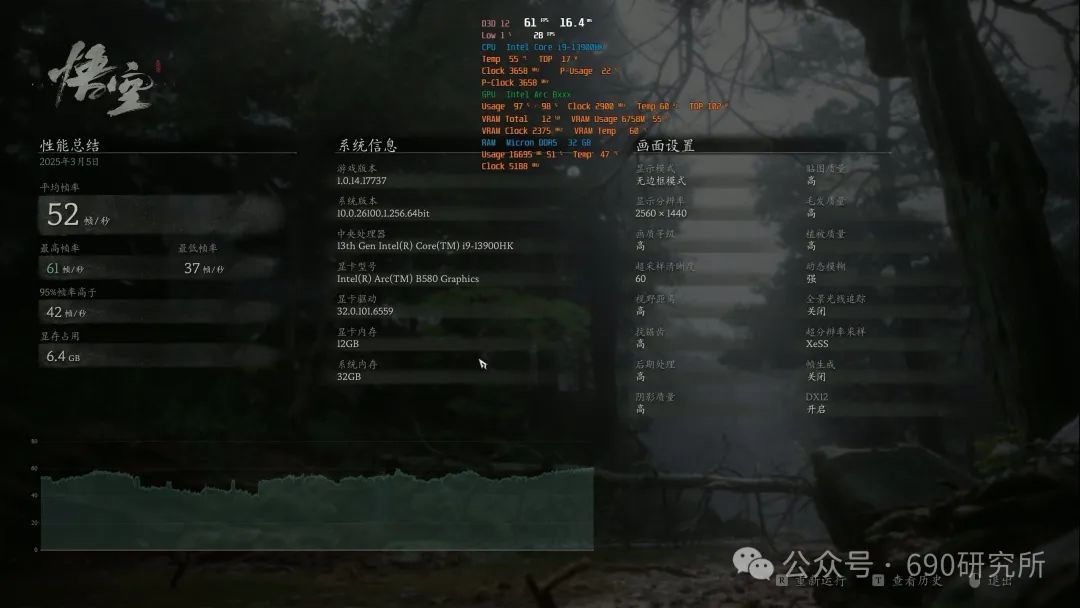 黑神話:悟空 高預設 2K分辨率 XeSS 銳化60 不開光追,此時基準測試幀率爲52幀,i卡在黑猴下還是劣勢,應該說是隻有40系及以上的N卡在黑猴下有點優勢,黑猴的優化還是比較一般的,比較喫顯卡,沒有幀生成的情況下比較喫力。