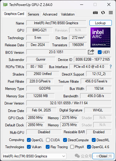 顯卡方面Intel Arc B580,核心規模上有2560個流處理器,5nm製程工藝,支持PCIe 4.0 x8通道,顯存方面共12G GDDR6,顯存位寬192bit。作爲2K價位段的新卡,這個表現還是不錯的。