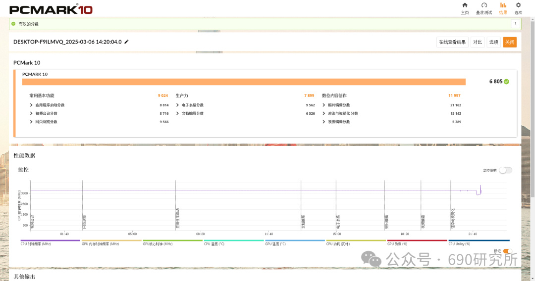在PCMark 10的測試當中,最終得分爲6805,常用基本功能9024分,生產力7899分,數位內容創作11997分,整體性能非常不錯,畢竟是6大核8小核的處理器,加上B580獨顯加持,性能與桌面平臺近似了。