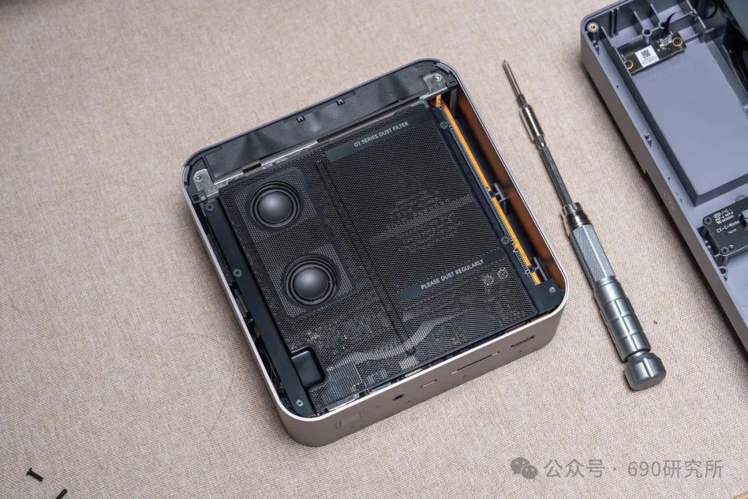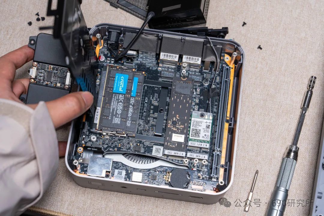再繼續往下拆就是主板部分,雙內存槽+雙M.2接口,背面是CPU和散熱模組。那需要注意的是GTi13 Ultra內部的設計較爲複雜,且爲內置電源,拆機時一定要注意放電,小白用戶還是不建議拆機了。