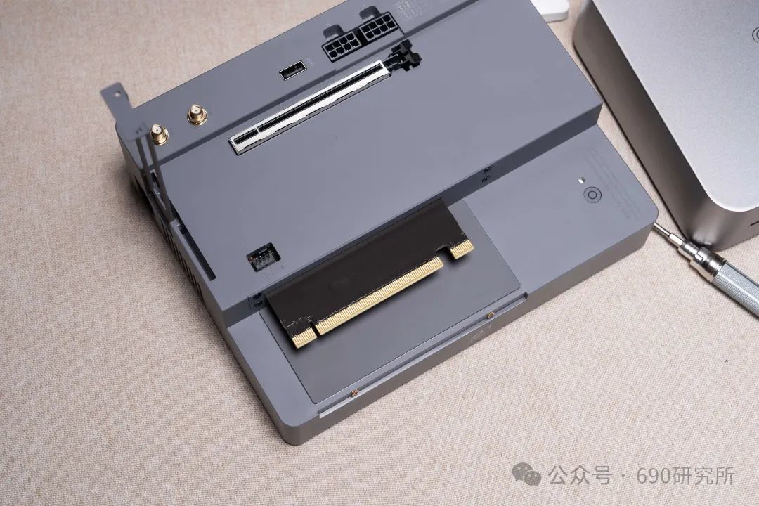零刻的方案不同於Oculink等轉接方案,他們直接在主板上設計了一個魔改的PCIe槽!通過專門設計配套的顯卡塢,最高可以實現x8通道連接顯卡,這個速率市面上大部分的顯卡都能做到無損連接。(這個魔改的方案零刻還進行了開源)