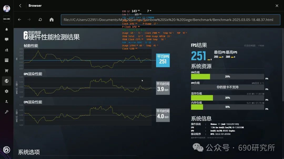 彩虹六號:圍攻 超高預設 2K分辨率,基準測試能達到251幀,此項目出乎意料,先前測得9800X3D搭配B580和7650GRE的成績都不如在零刻GTI13 Ultra+B580的成績。
