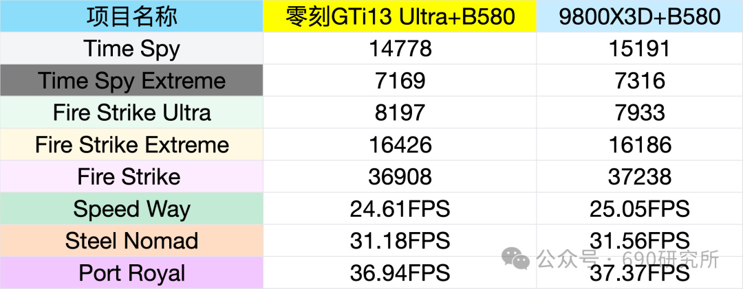 在3DMARK中各項數據如上,B580在此平臺上Time spy得分爲14778,爲了展現零刻外接顯卡與傳統桌面PC在性能上有什麼區別。這裏我們拉來了目前最強U 9800X3D搭配X870主板以及B580來對比測試,可以看到,零刻的表現與X870平臺上的測試基本相同,其它項目也與傳統桌面PC的得分相似。