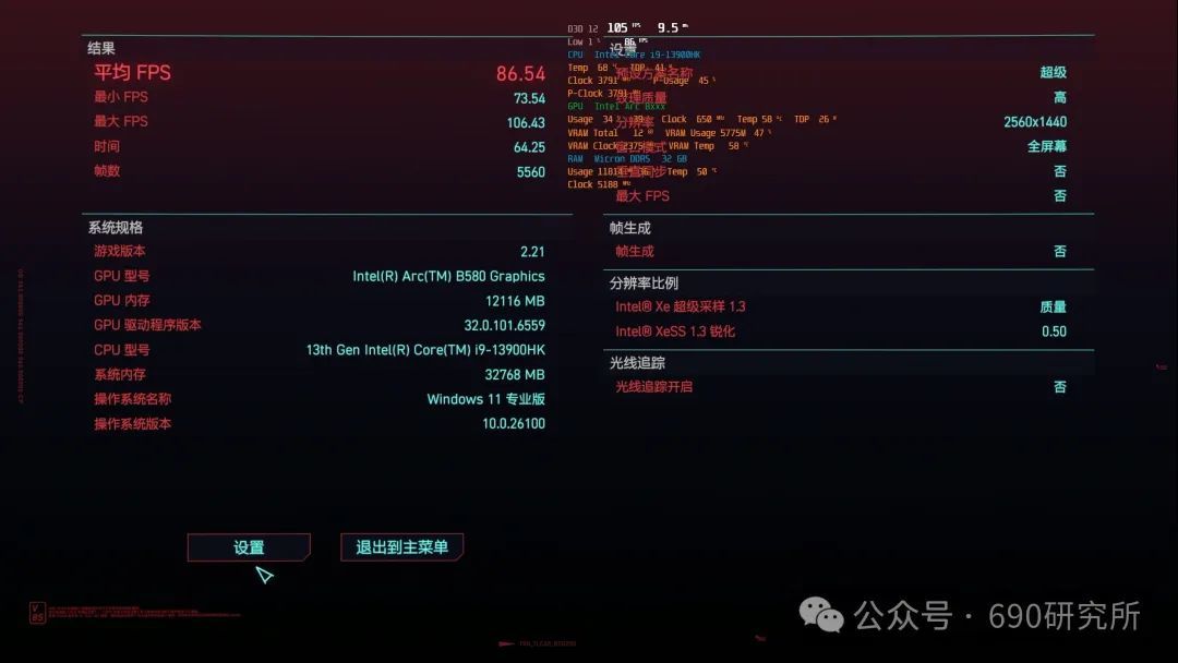 賽博朋克2077 超級預設 2K分辨率 不開光追 XeSS1.3 質量檔位 銳化0.5,基準測試得分爲86.54,對於一款FPS遊戲來說,這個幀數還是需要降低一些畫質才能爽完了,不過整體表現還是非常不錯的,XeSS質量檔位的畫面表現也是尚可。