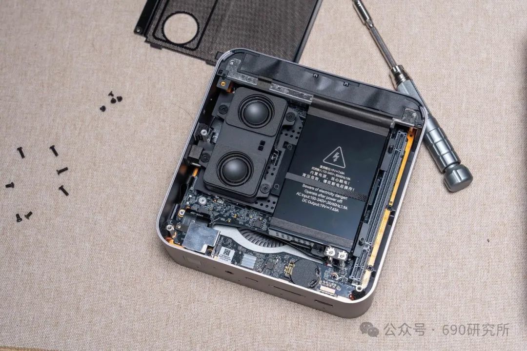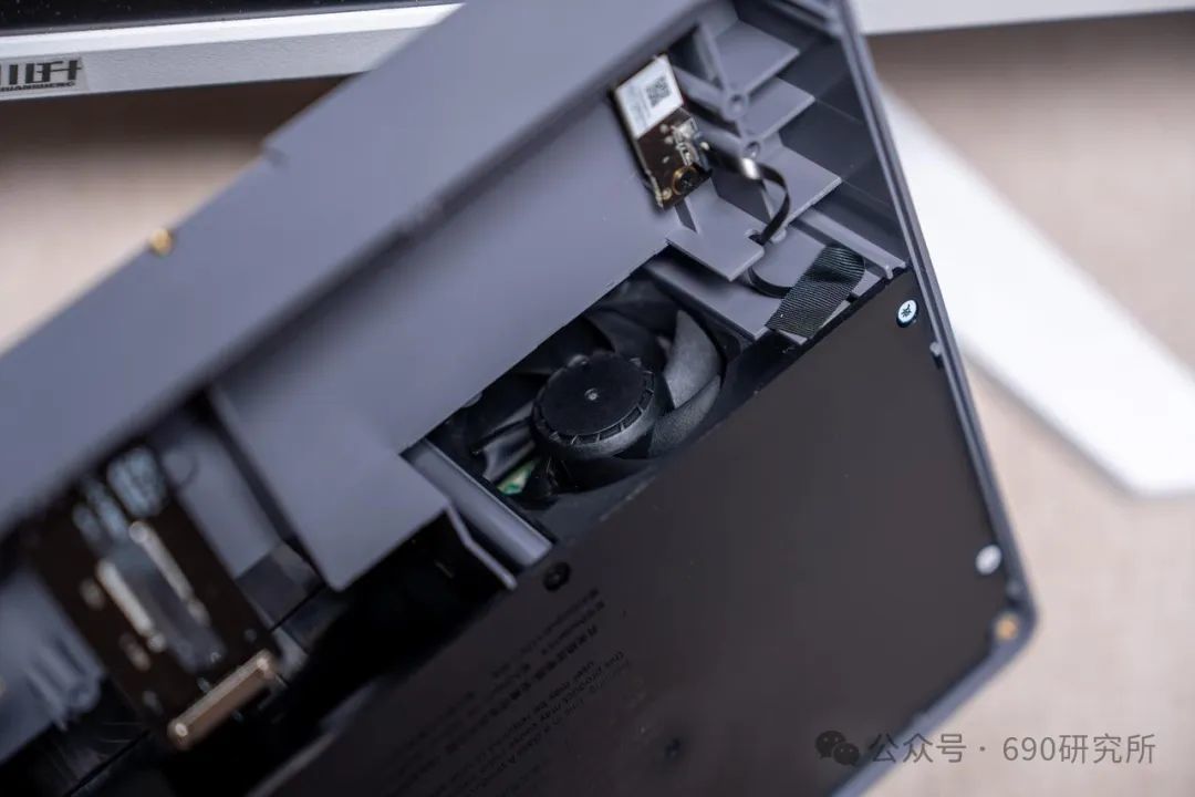 這一大塊佔據了一大半面積的就是內置電源,額定功率145W,能夠帶動最大TDP 65W的13900HX的。旁邊是兩個超大的內置音響,以前視頻中實測過零刻這套內置音響絕不是聽個響的級別,以我主觀感受來說是可以替代掉很多小音箱的,平放狀態下還差點意思,裝上拓展塢豎起來後聲場更悅耳。