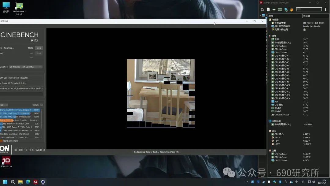cinebench R23滿載測試,CPU package功耗穩定在73度,功耗穩定54W,此時噪音距離機身5cm左右噪音也僅有39分貝左右,零刻這套模具+MSC 2.0散熱系統的噪音控制是相當優秀。