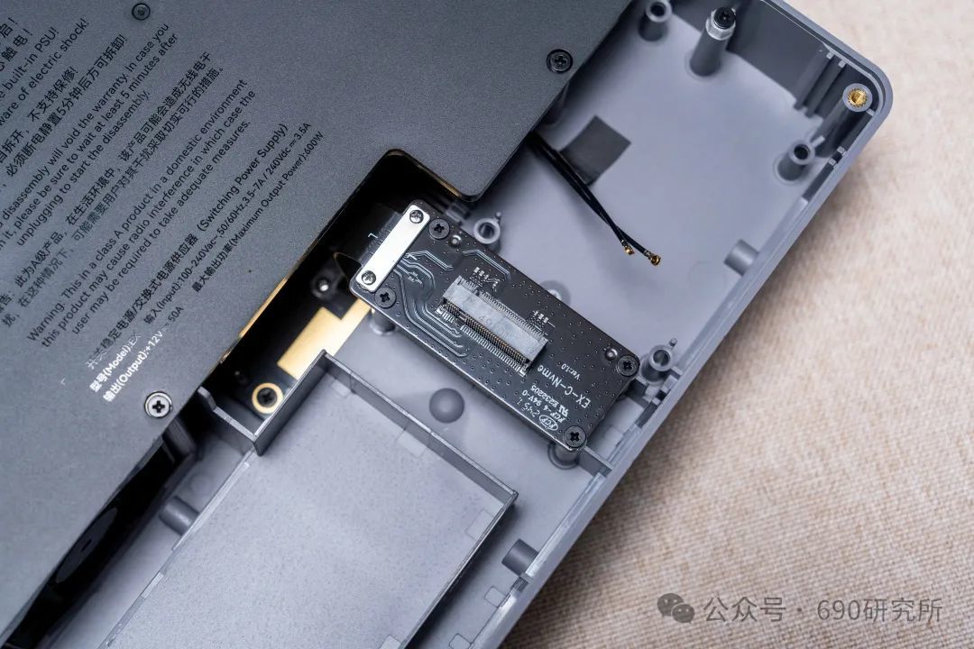 拓展塢內部還給到了一個x1通道的M.2接口可以選擇加裝M.2固態,也可以用附帶的WIFI模塊轉接板加裝無線網卡。