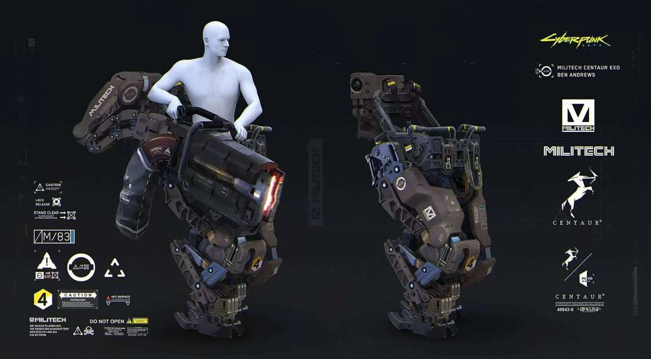 The Centaur is designed to provide its pilot with increased defenses while also granting powerful firepower. On the left arm, a large ballistic shield is installed that is able to cover most of the vulnerable area where the pilot is seated. Installed on the right arm and powered by an external power unit located on the spine is a thermal weapon that fires heat waves. After several shots, the power unit will become prone to overheating. While it is overheated, the exoskeleton cannot be operated by its user, leaving them vulnerable. Due to its size and weight, the exoskeleton also lacks agility.