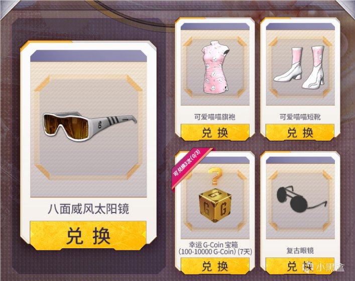 派对屋奖励包括全新的八面威风太阳镜、可爱喵喵套装、复古眼镜、胜利之舞130(青海摇)、金色守护者P90等,最吸引人的莫过于可兑换三次的幸运G-Coin宝箱。