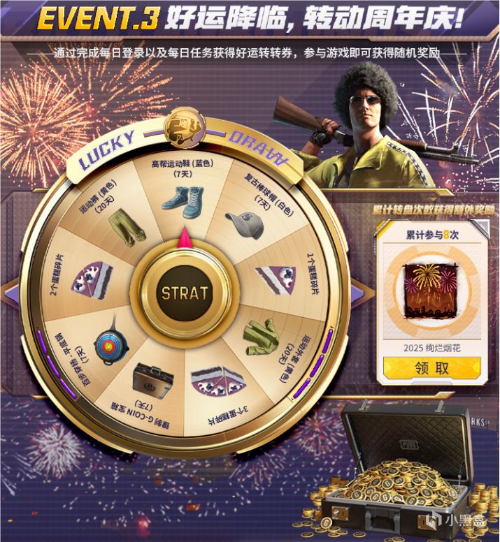 前面每日登录和任务中获得的转转券可转动周年庆转盘,转盘内有各类限时游戏皮肤、G-Coin宝箱以及蛋糕碎片。