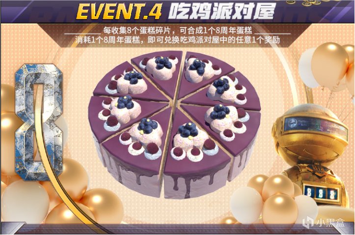 每收集8个蛋糕碎片,可合成1个8周年蛋糕,可在吃鸡派对屋中兑换任意1个奖励。