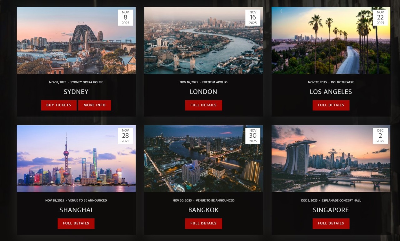 首先是悉尼场(2025年11月8日),在悉尼歌剧院举办,目前可购票,还有位置可选。(截止撰稿时)