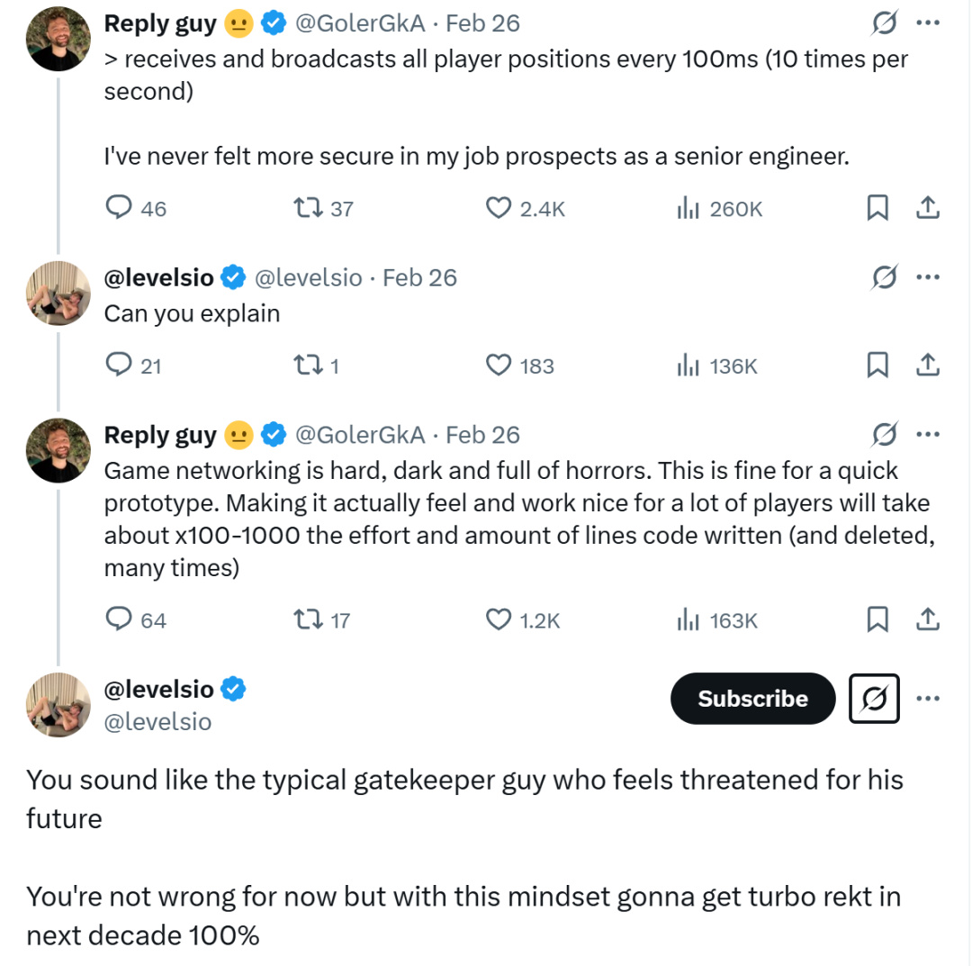 一名高級工程師表示讓多數玩家能有良好的聯網體驗,需要付出百倍乃至千倍的工作量,fly.pieter的現狀讓他對自身的就業前景感到樂觀,Pieter譏諷他是個典型的保守派,現在看起來是對的,但未來10年這種心態就會崩潰。