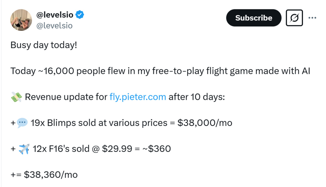 近日,一名海外開發者用AI工具從零搭建了一款飛行模擬器,依靠廣告及內購在10天內賺到了3.8萬美元,開發者發表的推特甚至引起馬斯克注意,他爲其點贊並將該遊戲分享給2億粉絲,爲原帖貢獻了900萬瀏覽量。