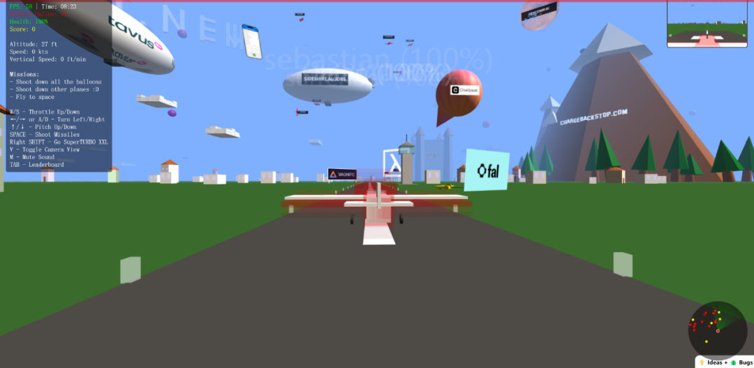 畫面左上方是操作手冊與飛機運行參數,大體玩法就是操控飛機飛行,射擊球體得分,擊落其他玩家機體,一個夠不到及格線的.io遊戲,既無體積碰撞,也無成長反饋。要是玩家將目光着眼於天邊的發光星體,大概率會被吸進“黑洞”裏,星體遙不可及,而返鄉已是惘然。