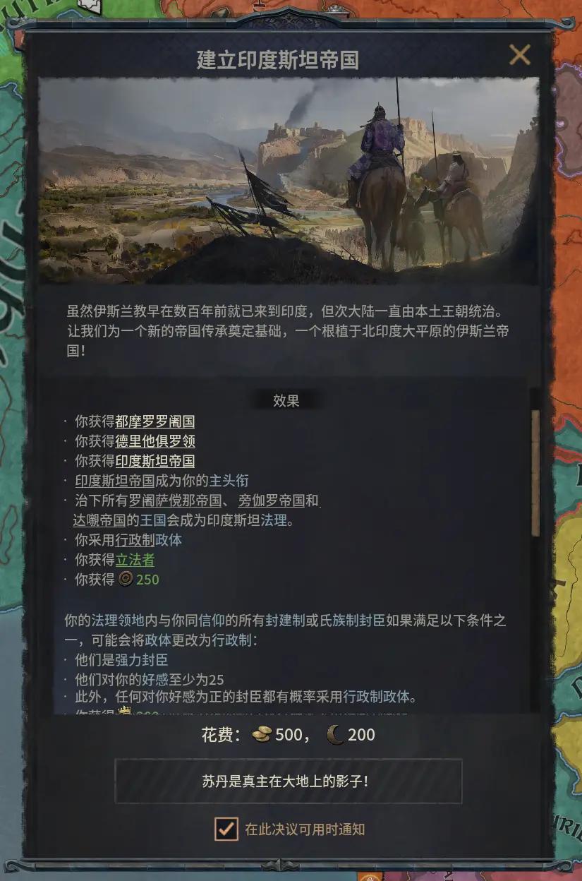 ***征服印度並非在每局遊戲都會發生,但真發生時,很少會看到德里蘇丹國的出現。新決議允許控制北部相當一部分地區的穆斯林統治者將首都遷至德里或拉合爾,同時創建一個新的帝國頭銜,並整合3個印度帝國中任一業已持有的。如果擁有「權力之路」,這也會給你行政制政府,儘管繼承製是世襲而不是歡呼。