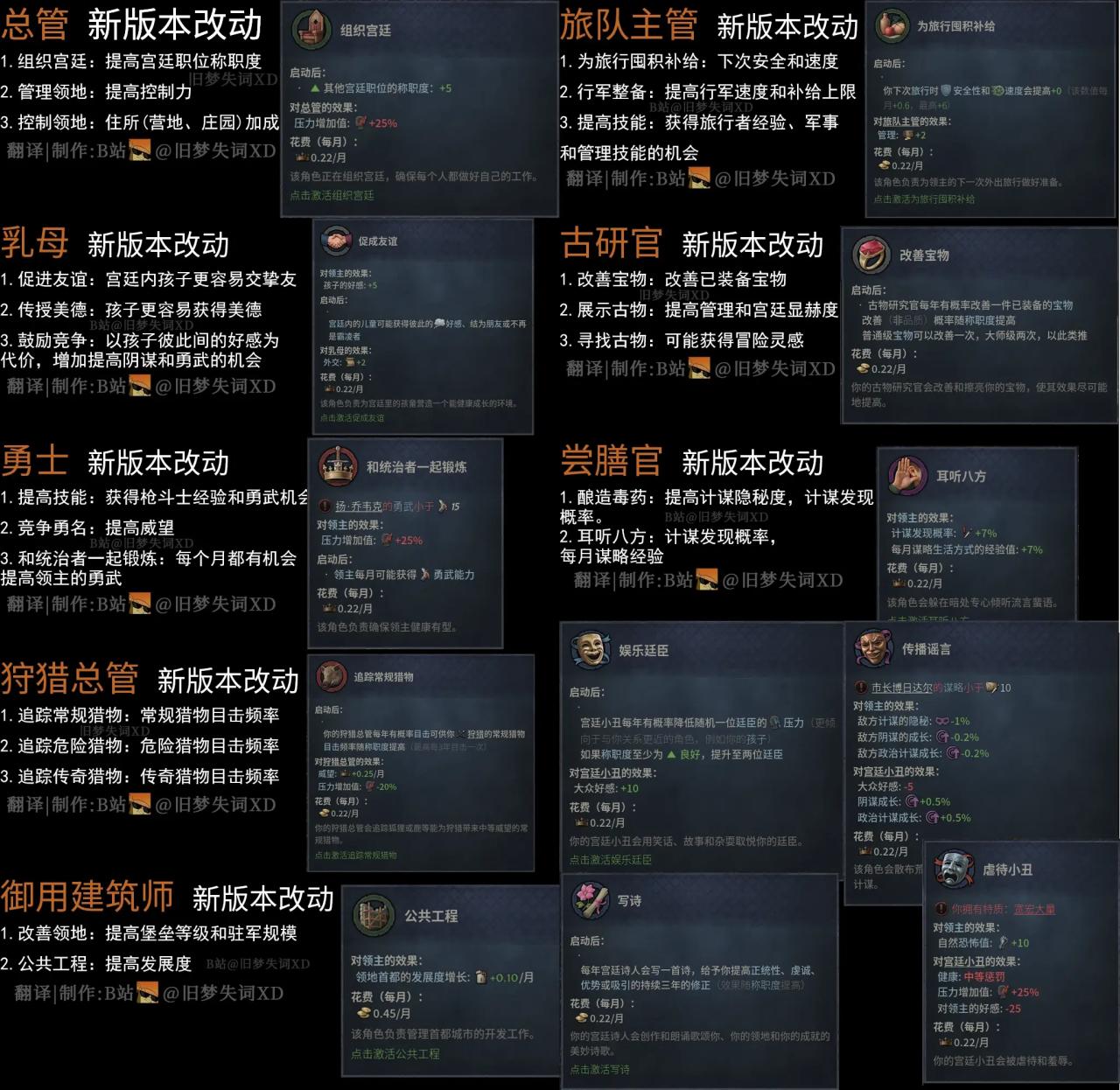 新增宮廷任務數量龐大難以詳述,以上僅展示冰山一角。多數職位現提供三項可選任務(少數爲一至兩項),涵蓋豐富功能:從乳母向子女灌輸美德,到古物研究官探尋稀有聖遺物線索,再到施賑吏總長提升狂熱封臣好感等等。